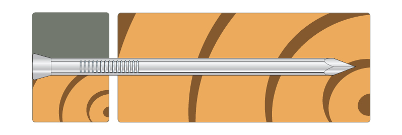 Nail with a countersunk head and grooved shank for use indoors for fitting moulding or fixing hardwood and semi-hardwood boards to a wood base.