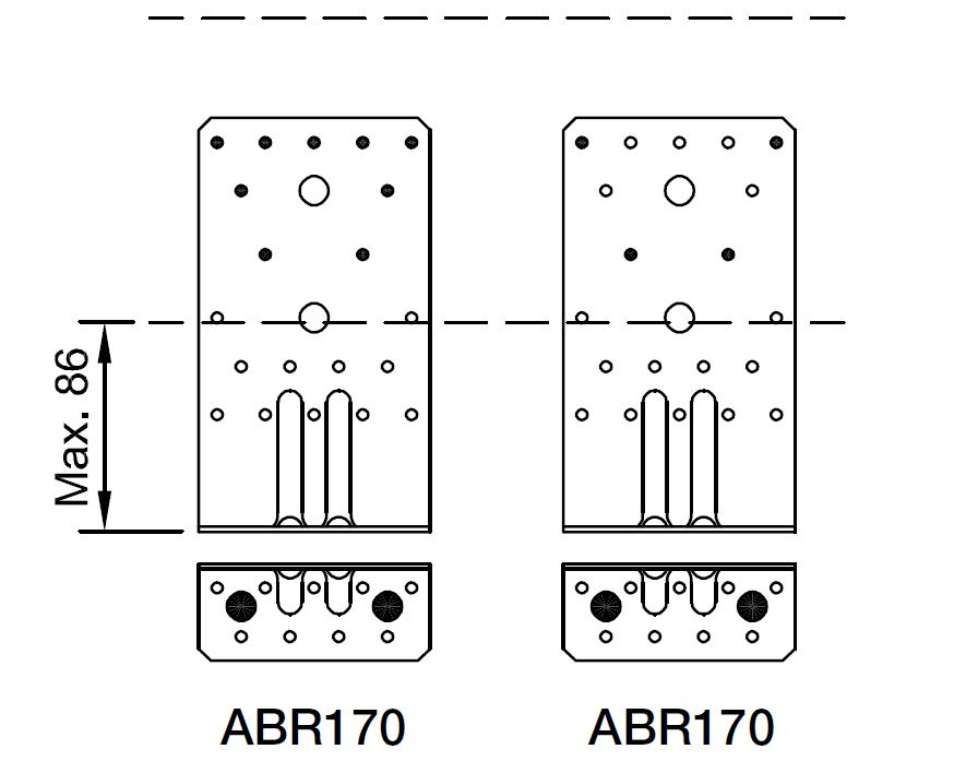 Palkin etäisyys tukeen on oltava alle 132 mm kulmalevylle ABR220 ja alle 86 mm kulmalevylle ABR170.