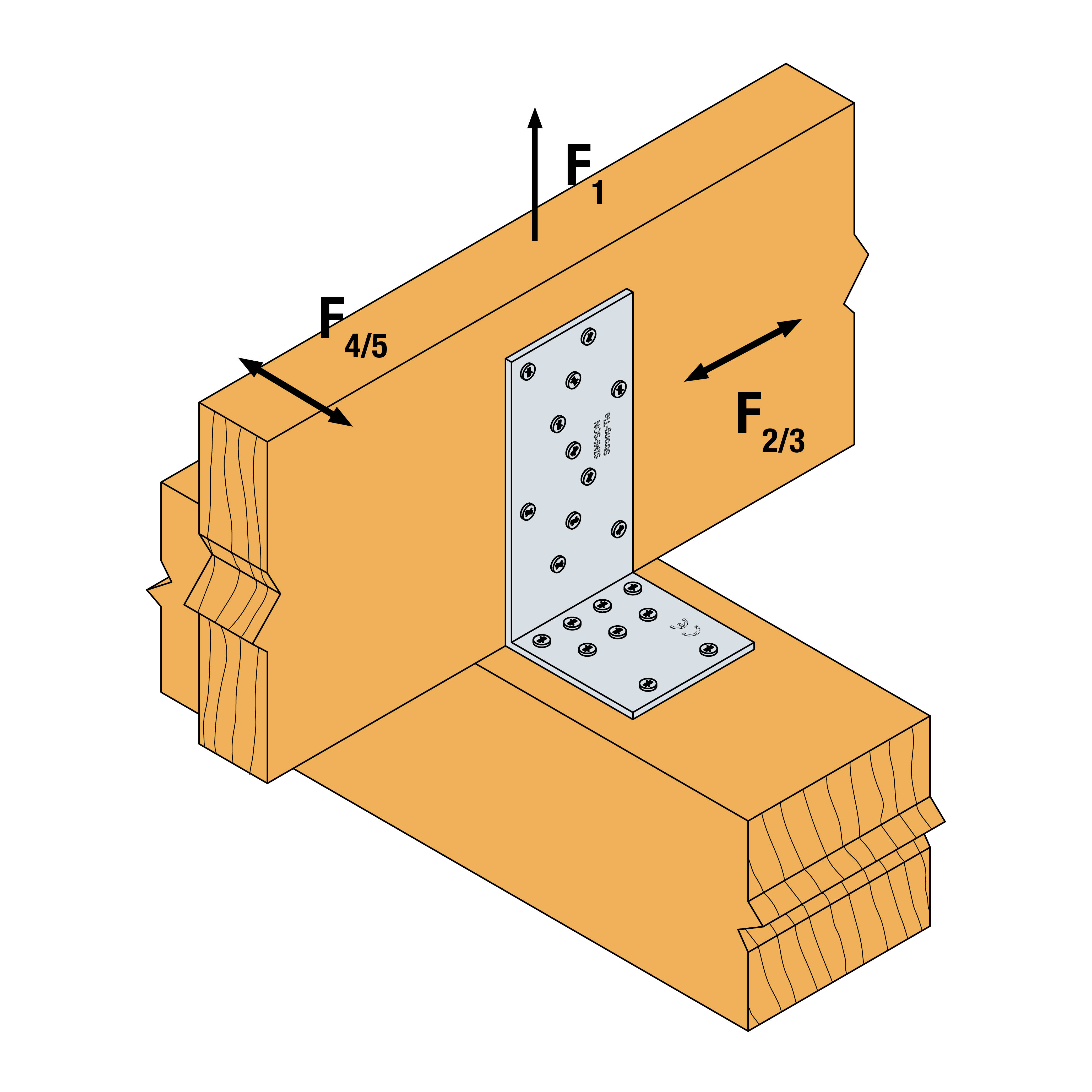 ** Kiinnitys: Täysi kiinnitys CNA4,0x40-naulauslevynauloilla kulmalevyn pystyosaan ja CNA4,0x60-naulauslevynauloilla kulmalevyn vaakaosaan. Jos ylemmän palkin kiepahdus on estetty, kestävyyden ominaisarvot R1,k ja R2/3,k liitokselle, jossa on vain yksi kulmalevy, ovat puolet taulukon arvoista. Jos palkin kiepahdusta ei ole estetty, lisätietoja on ETA-tiedoissa.