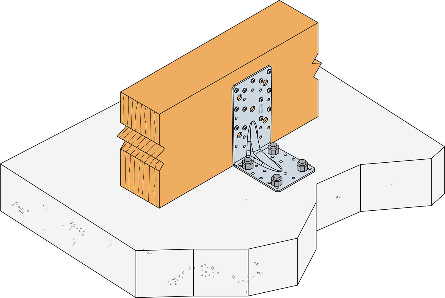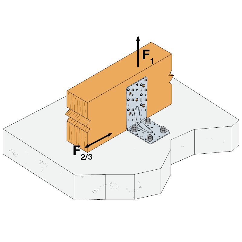 The bolt design resistance requirement R#,d is determined from (bolt factor x connection design load F#,d) for the required load direction and fastener. Refer to the Simpson Strong-Tie anchor product range for suitable anchors. Typical anchor solutions are BOAXII, SET-XP, WA, AT-HP, depending on the concrete type, spacing and edge distances.
