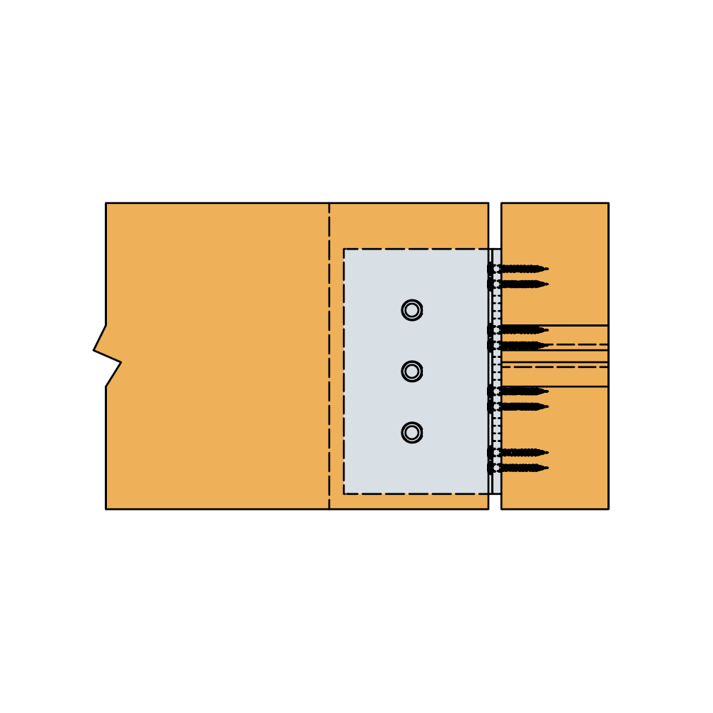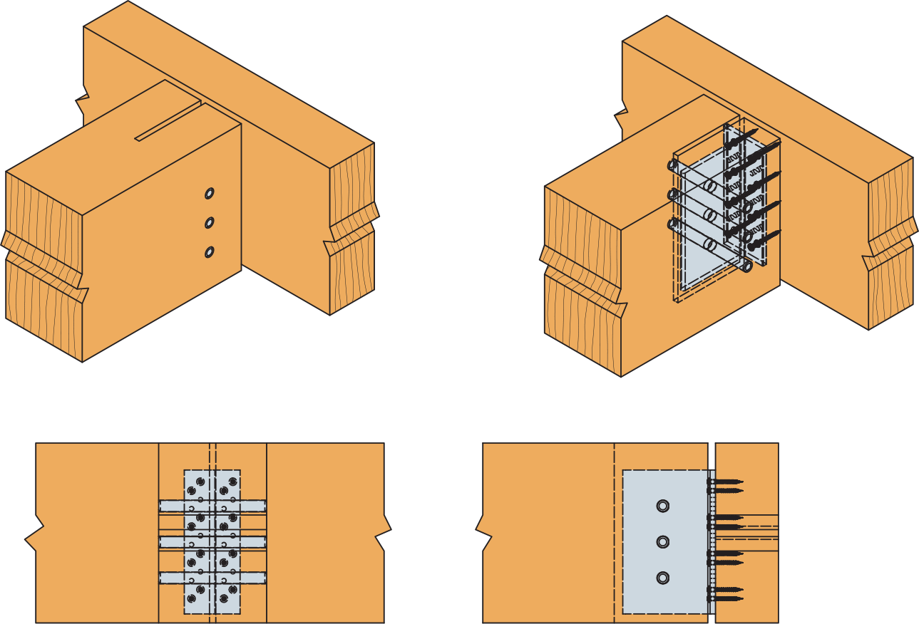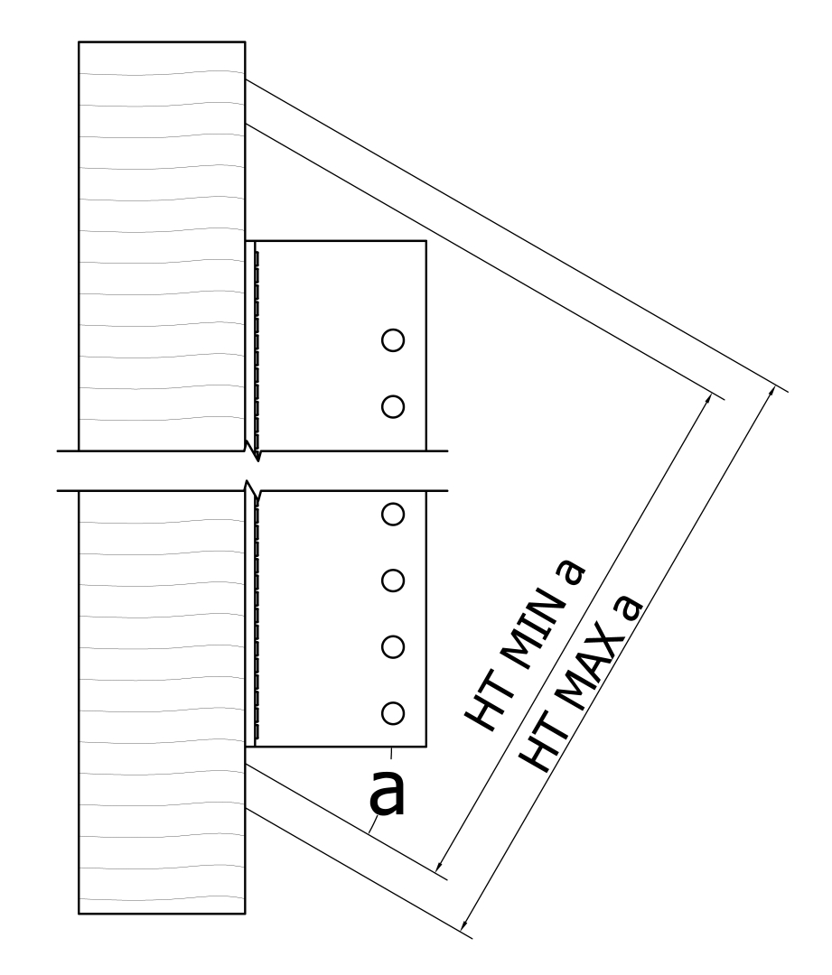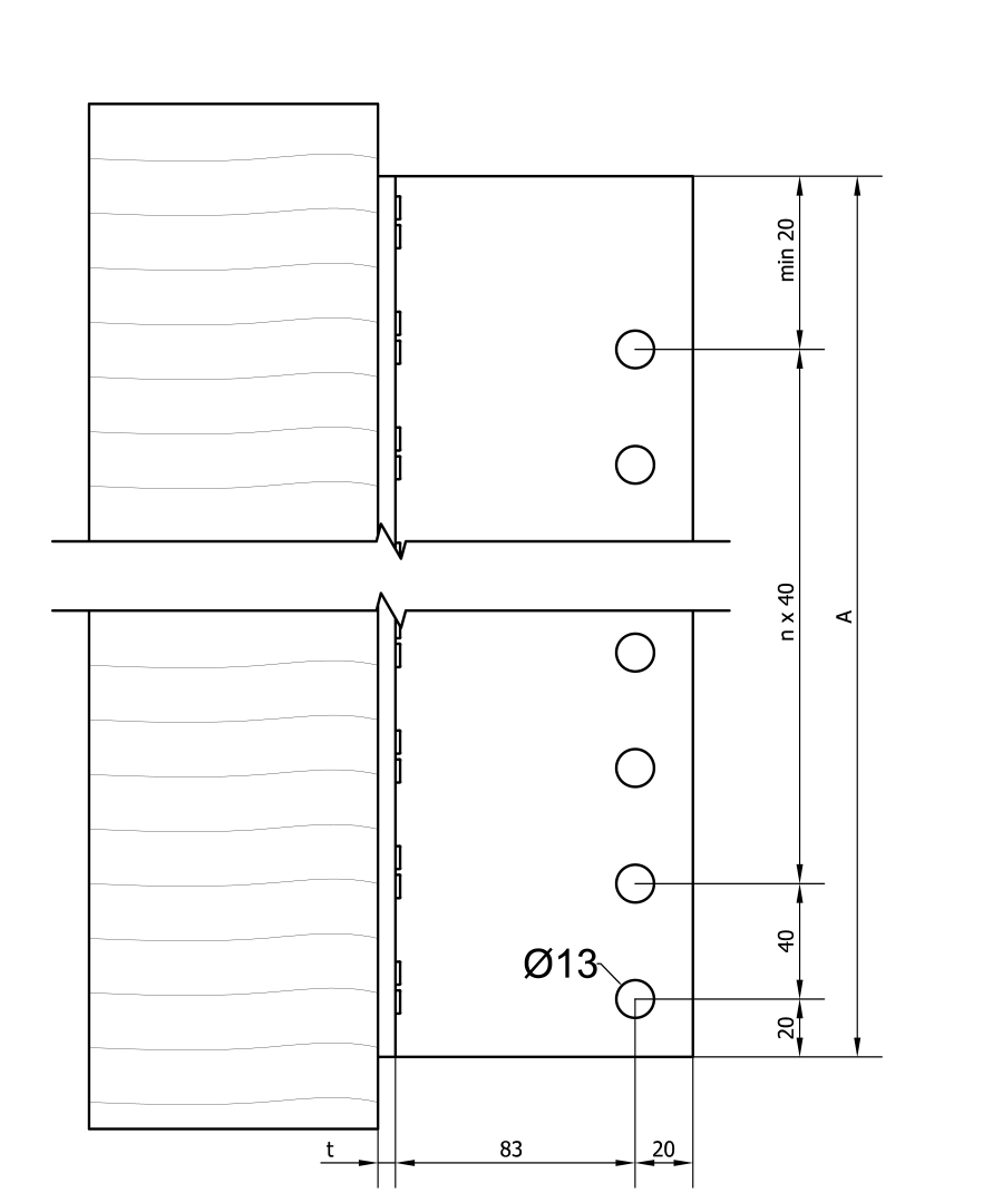 - Sekundääripalkin päätyyn tehdään 7-8 mm leveä lovi. Teräsvaarnoja varten esiporataan Ø8 tai Ø12 mm:n reiät (käytä mahdollista porausmallinetta). Etäisyyden ylimmästä vaarnan reiästä palkin ylälaitaan tulee olla vähintään 50 mm (BT4-90 tai BTN90: vähintään 35 mm).
