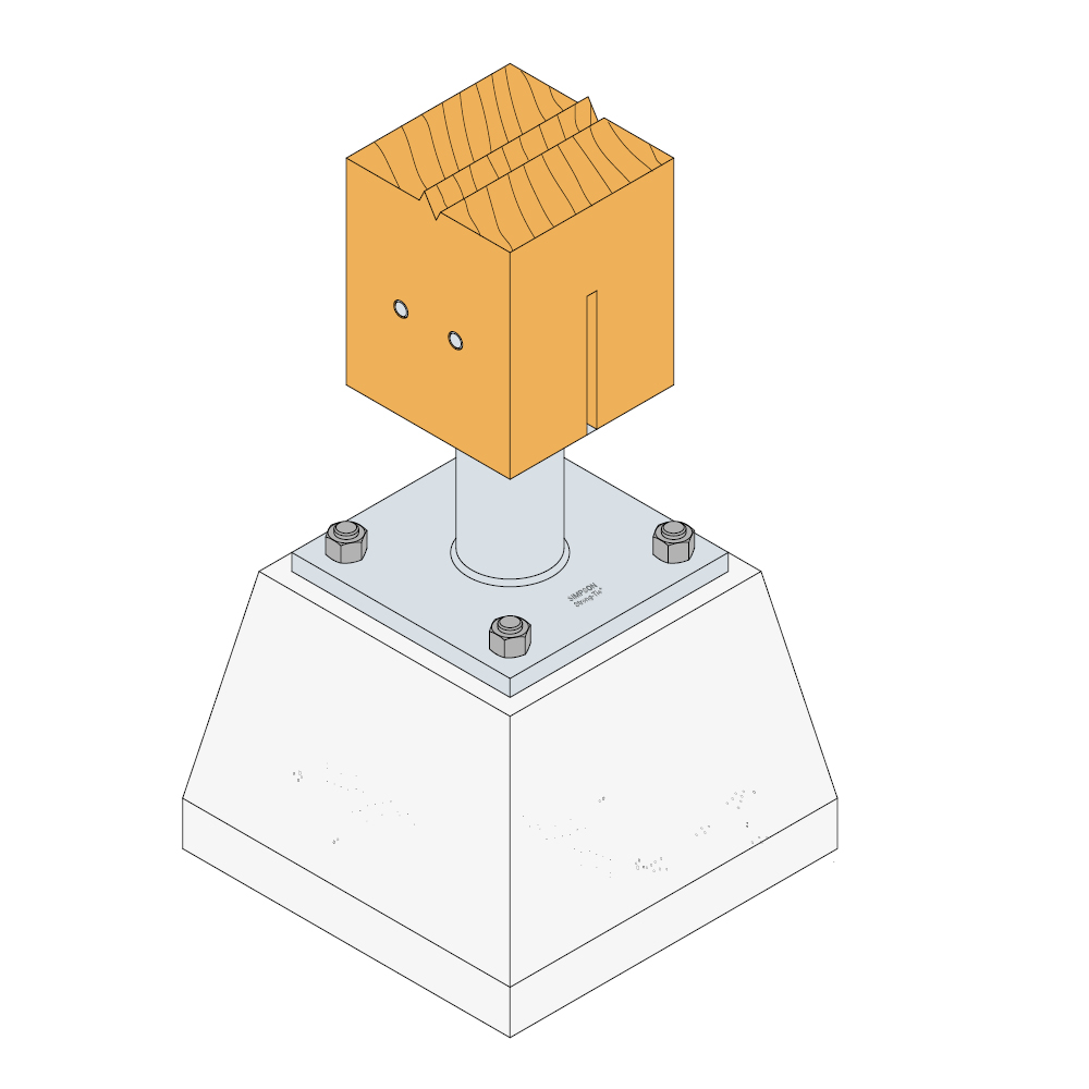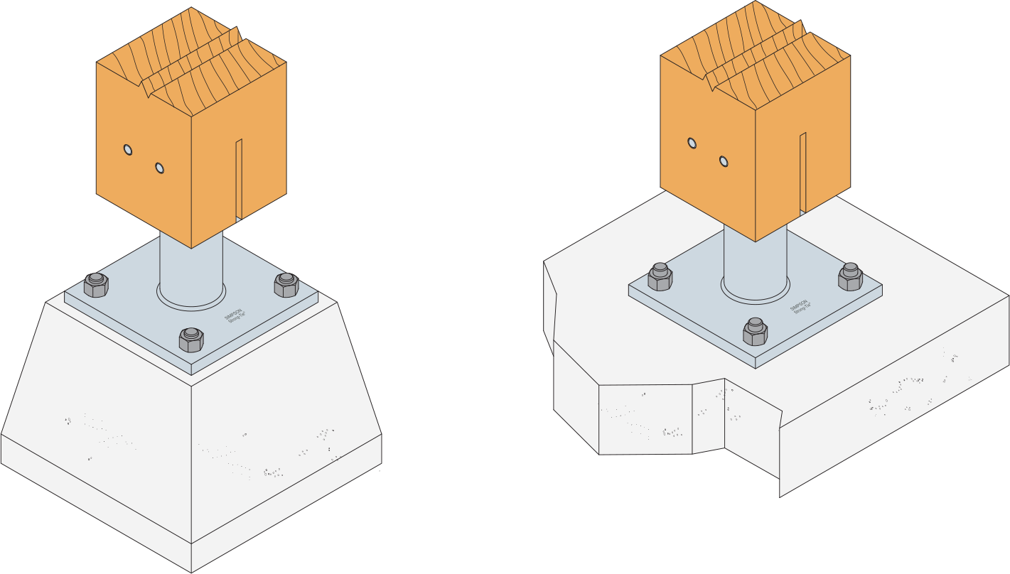 - Liimapuupilarin pohjaan tehdään 9–10 mm leveä ura, johon kiinnike kiinnitetään neljällä M8- tai kahdella M12- kuumasinkityllä vaarnalla, joiden pituus vastaa pilarin leveyttä
