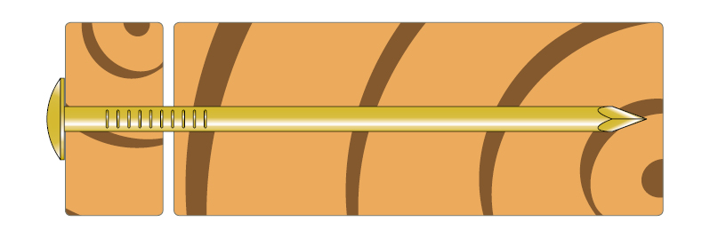 Brass pin with an oval head and round shank that can withstand rain, but used mostly indoors for fixing, e.g., mouldings and architraves to timber base material, as well as for various types of hobby activity.