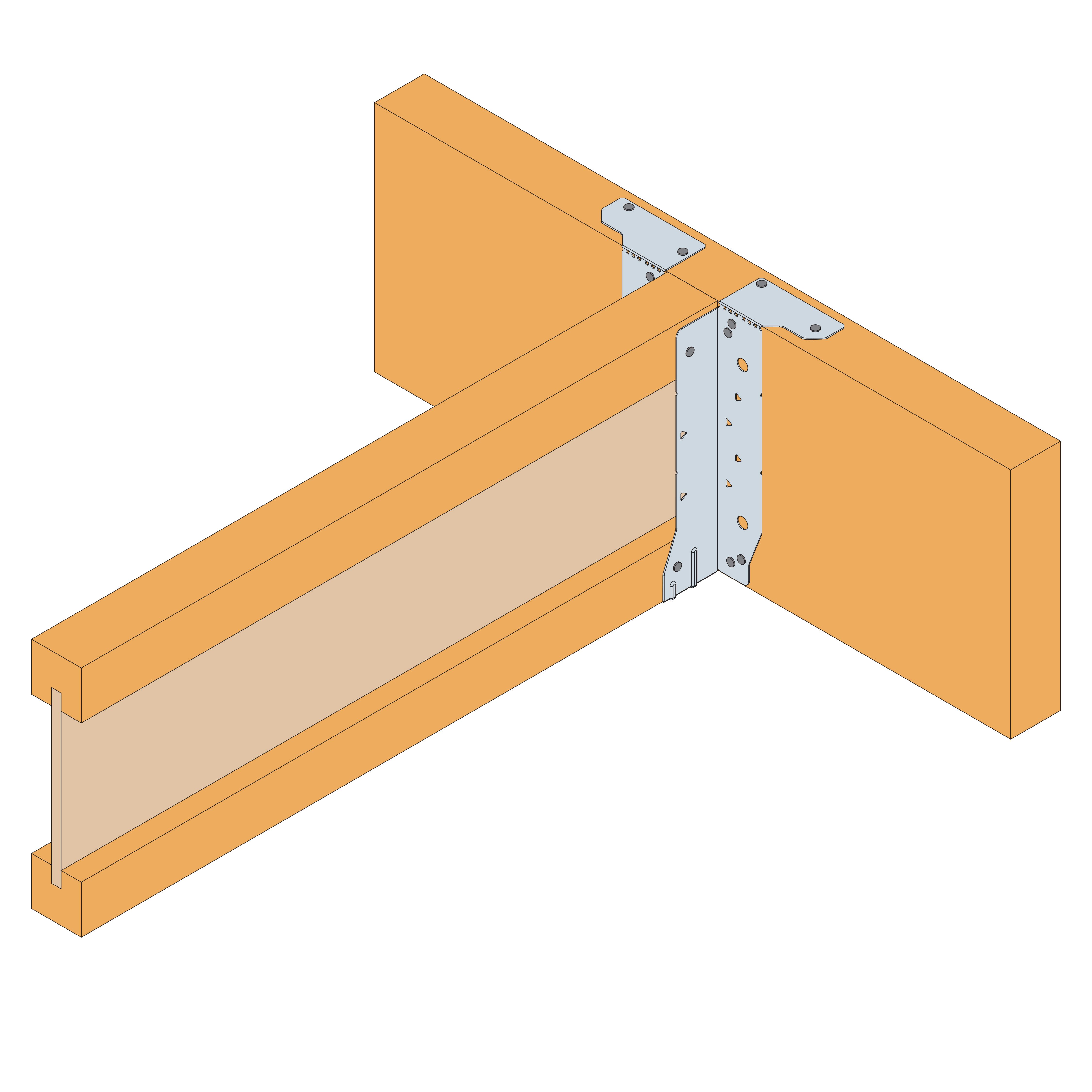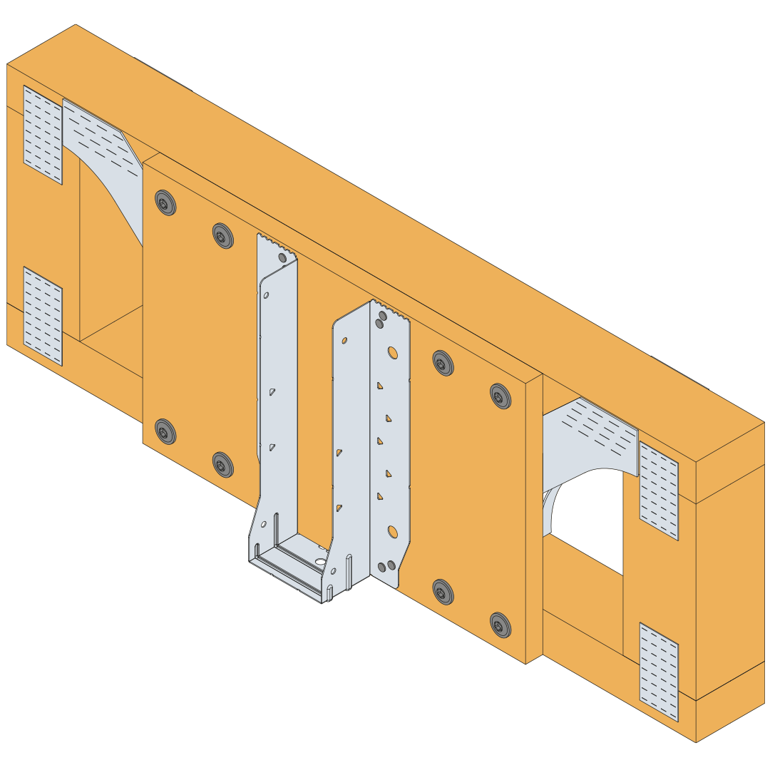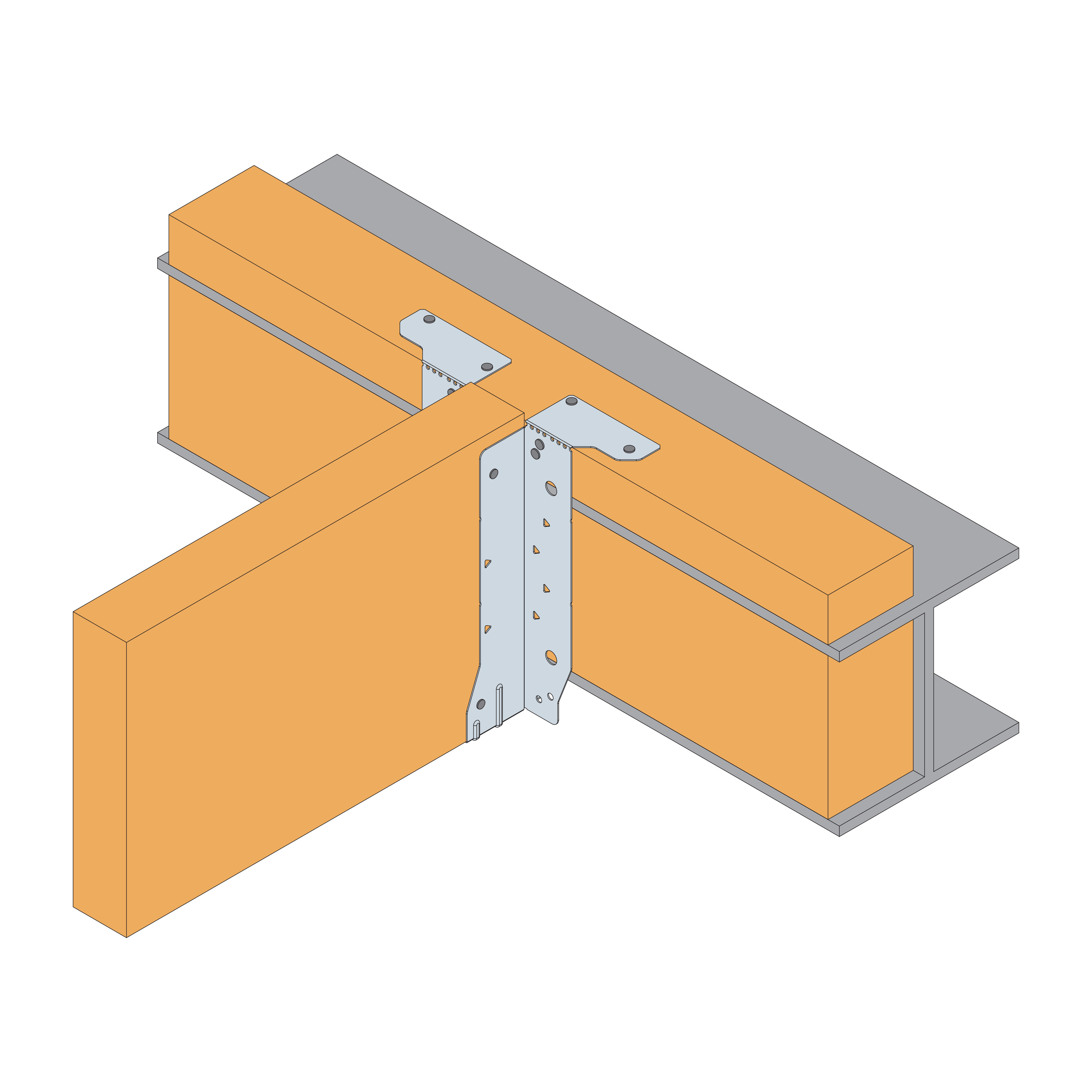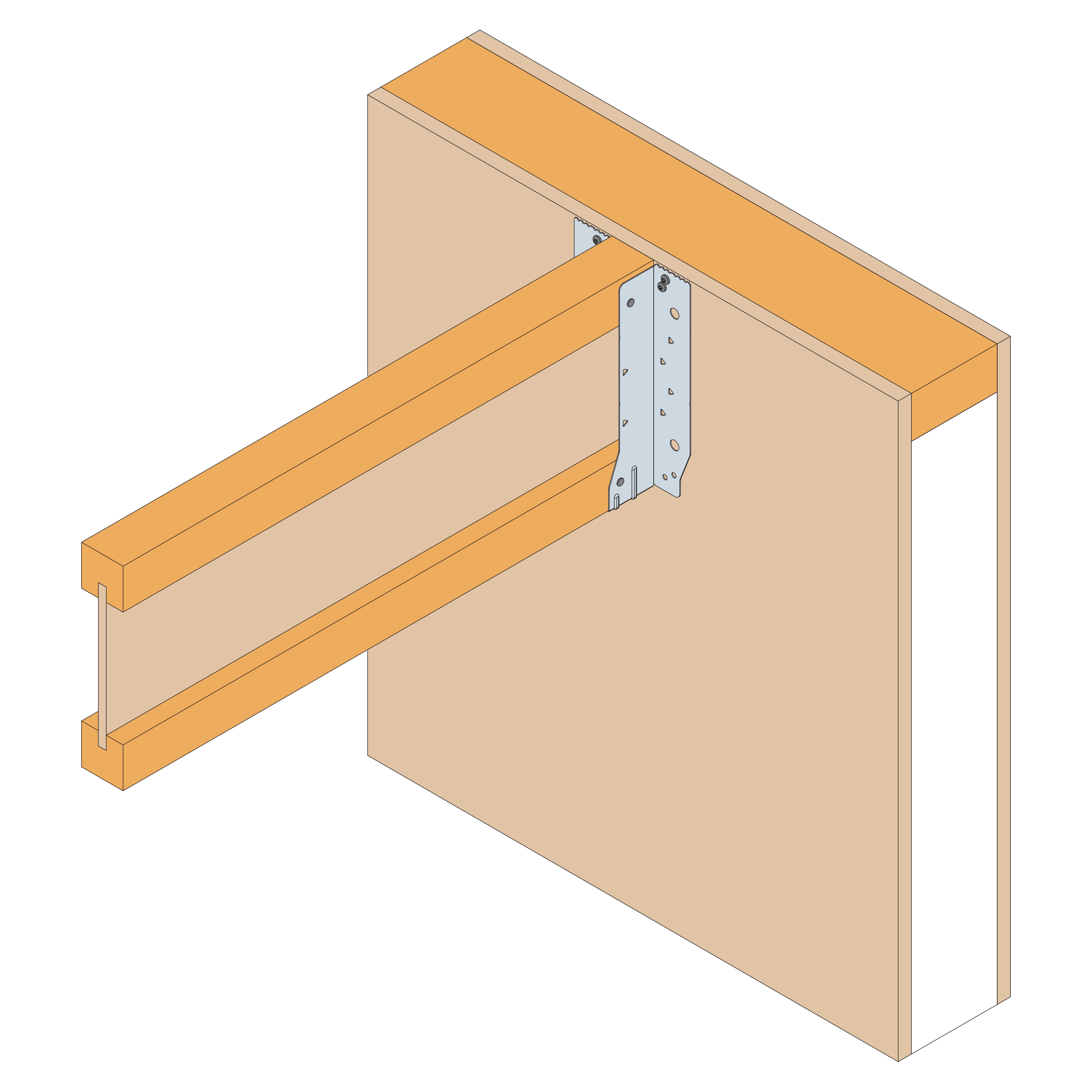 - Aseta tuleva palkki paikoilleen niin, että se on tiiviisti EWH-kannattimen takaosaa vasten (suurin sallittu rako on 3 mm tulevan palkin pään ja kannattimen etupinnan välillä) ja täytä kaikki pyöreät reiät sivulaipoissa.