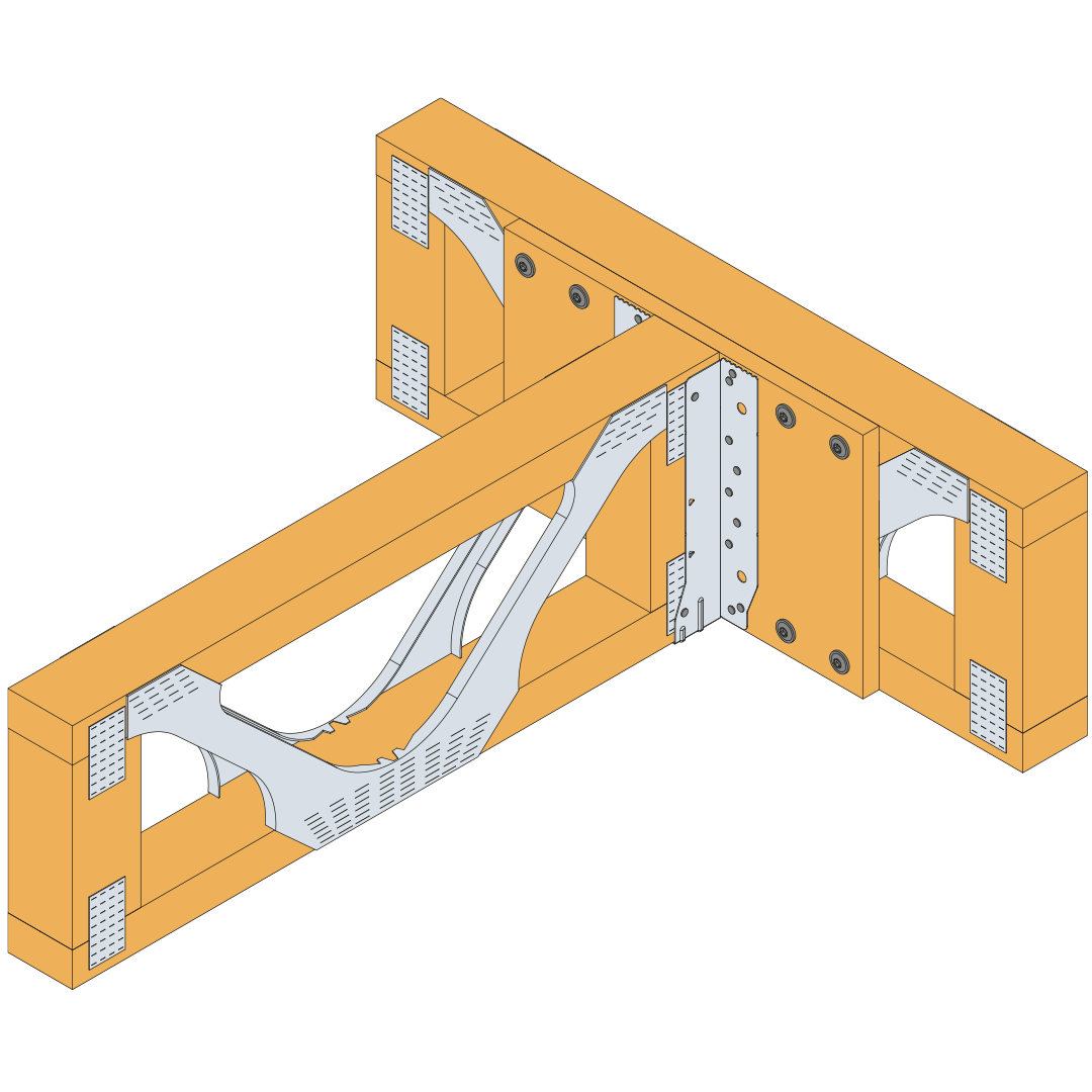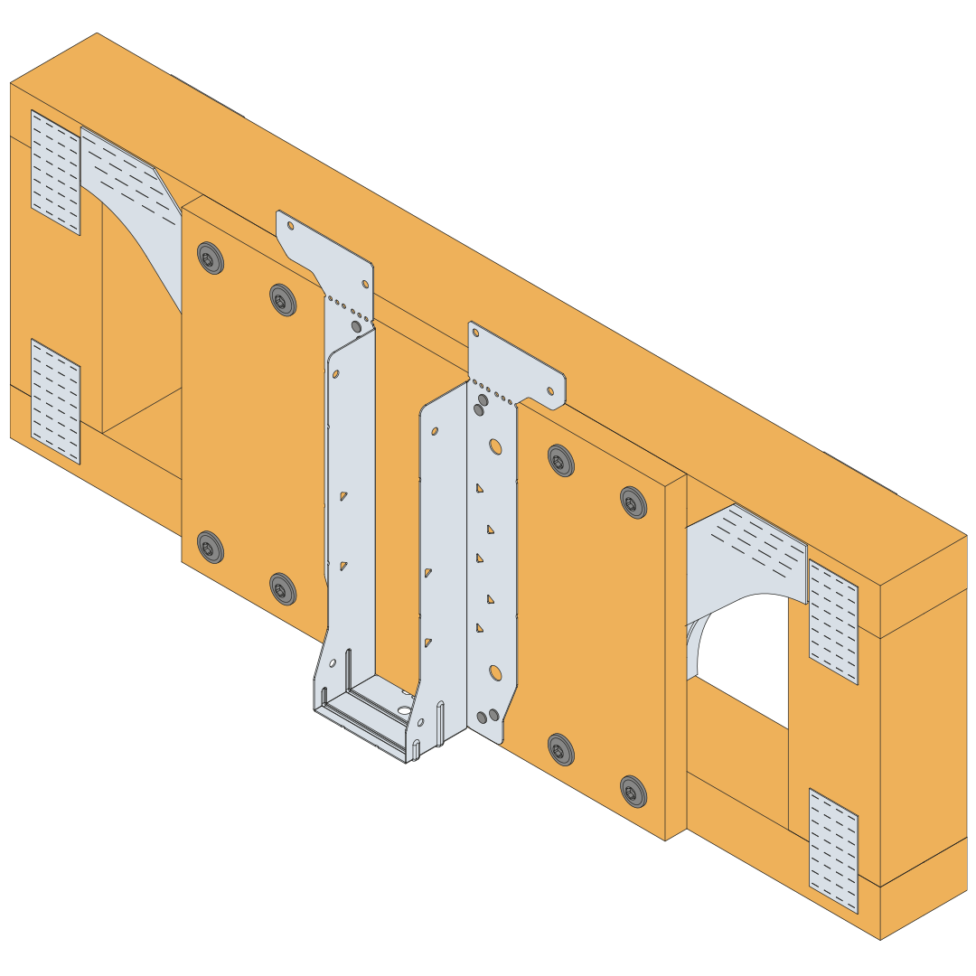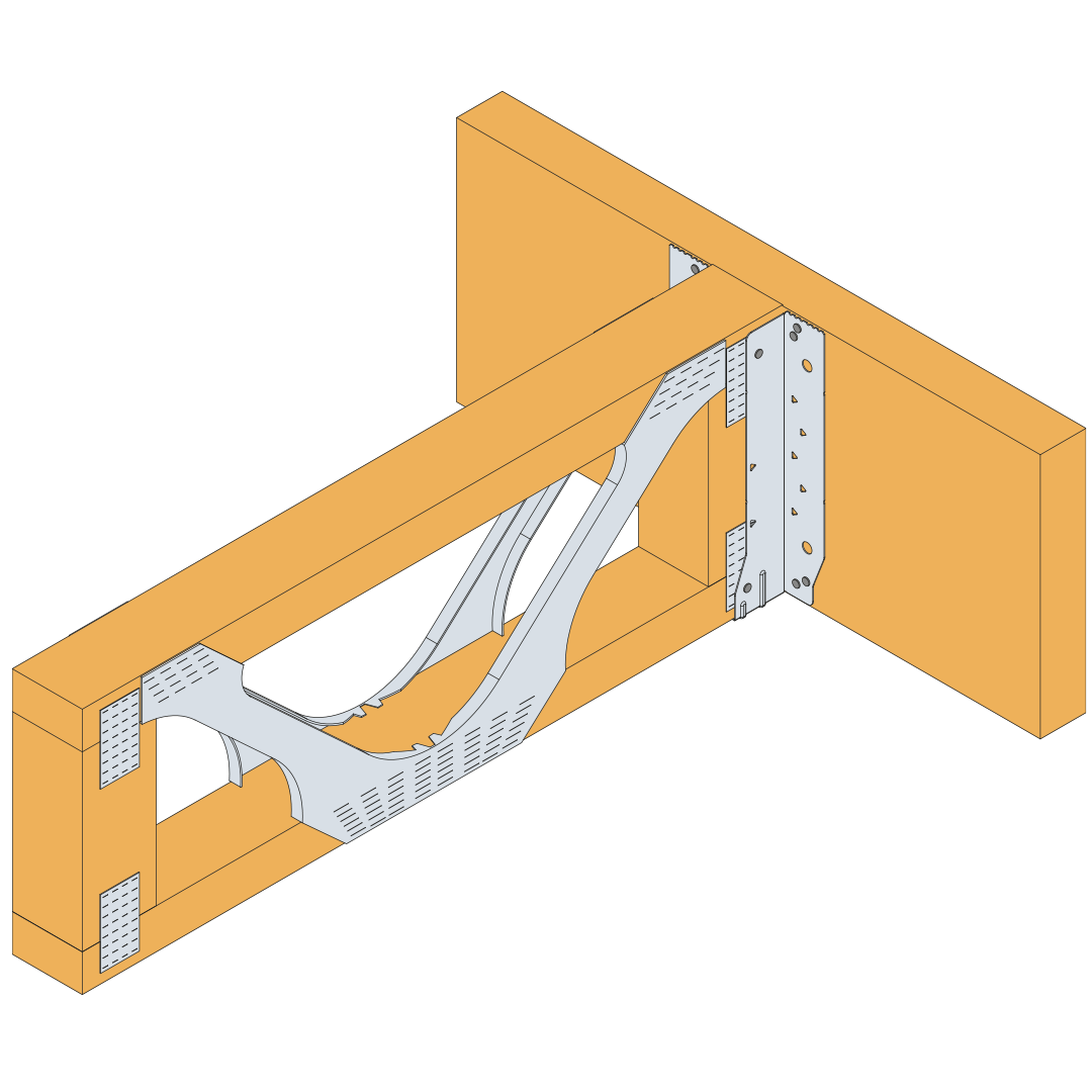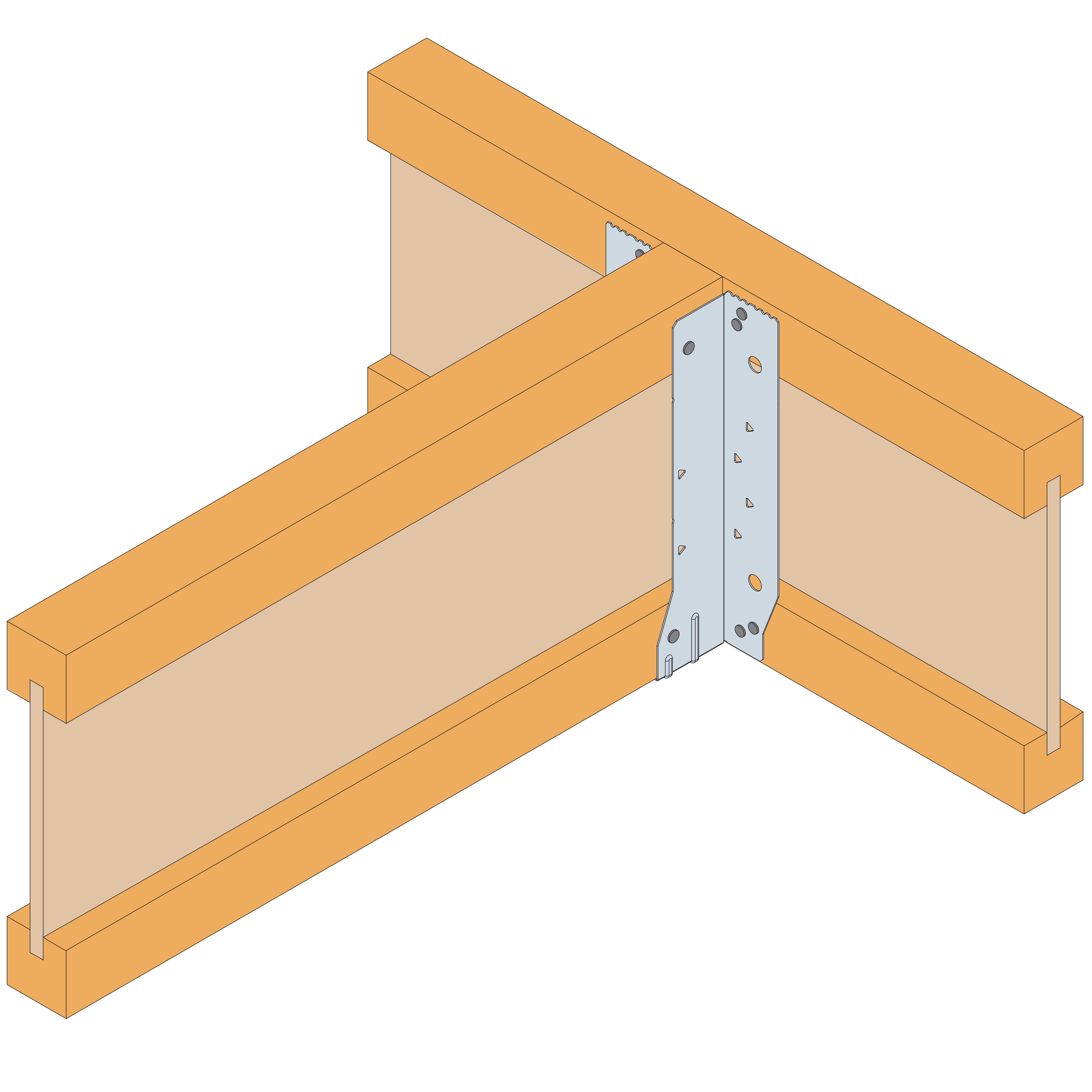 - Aseta tuleva palkki paikoilleen niin, että se on tiiviisti EWH-kannattimen takaosaa vasten (suurin sallittu rako on 3 mm tulevan palkin pään ja kannattimen etupinnan välillä) ja täytä kaikki pyöreät reiät sivulaipoissa.