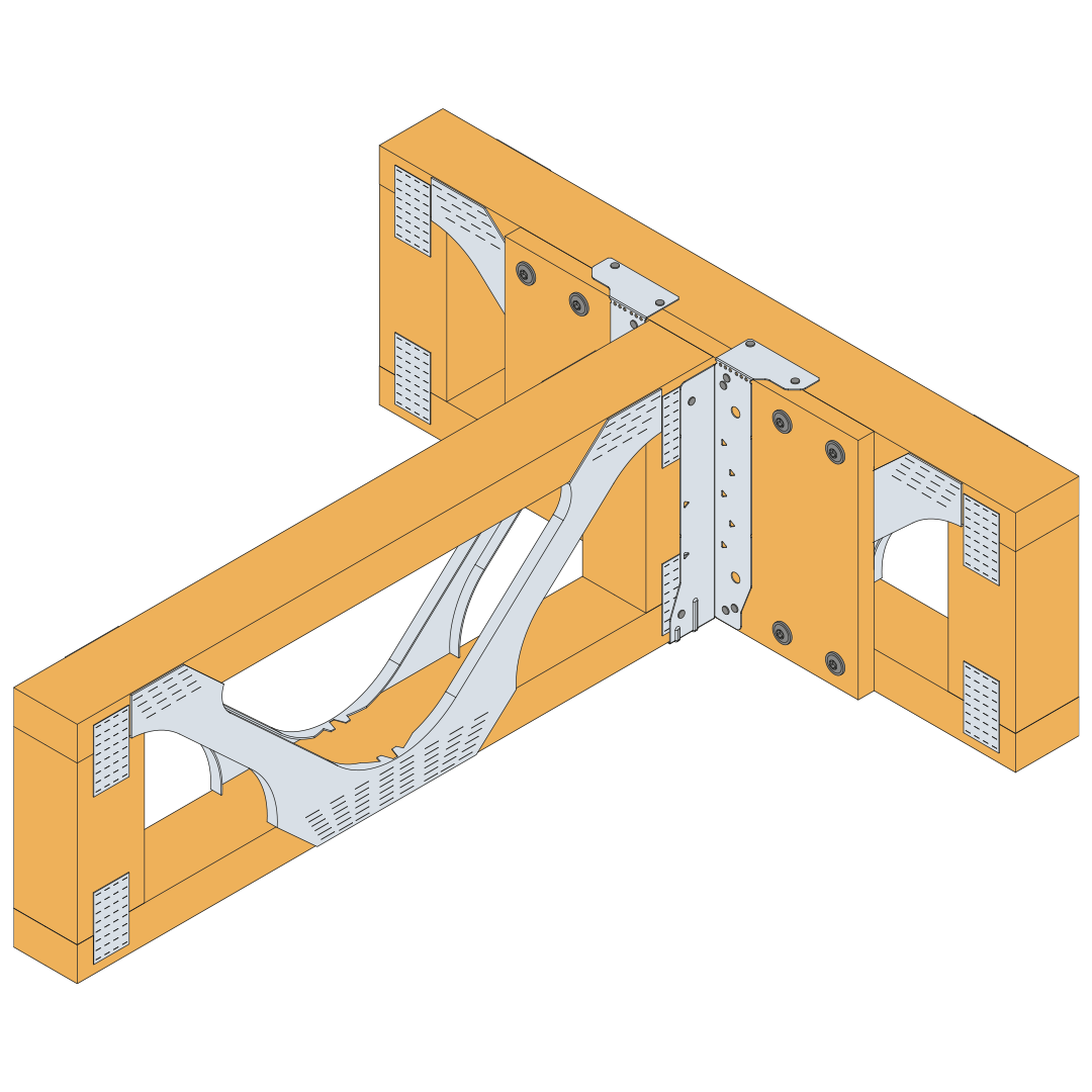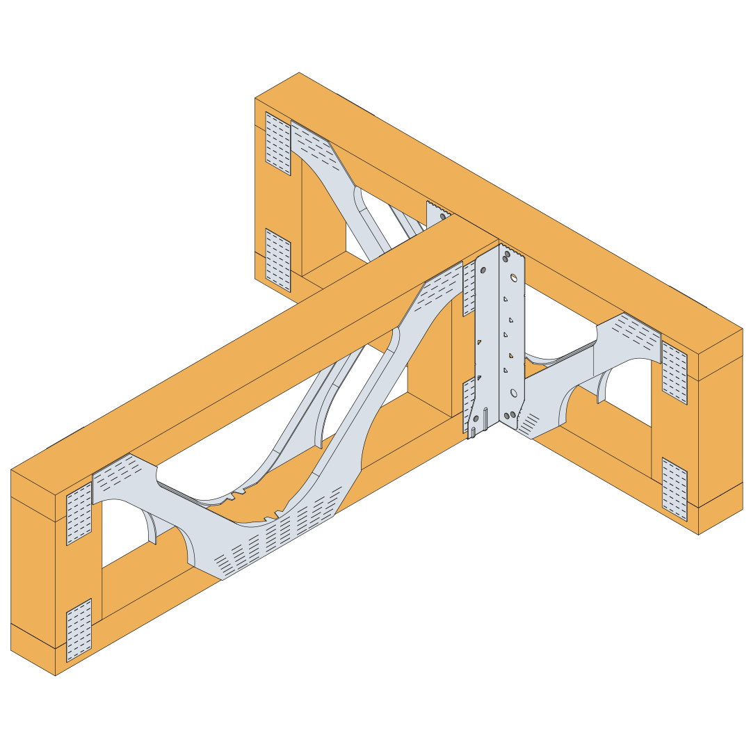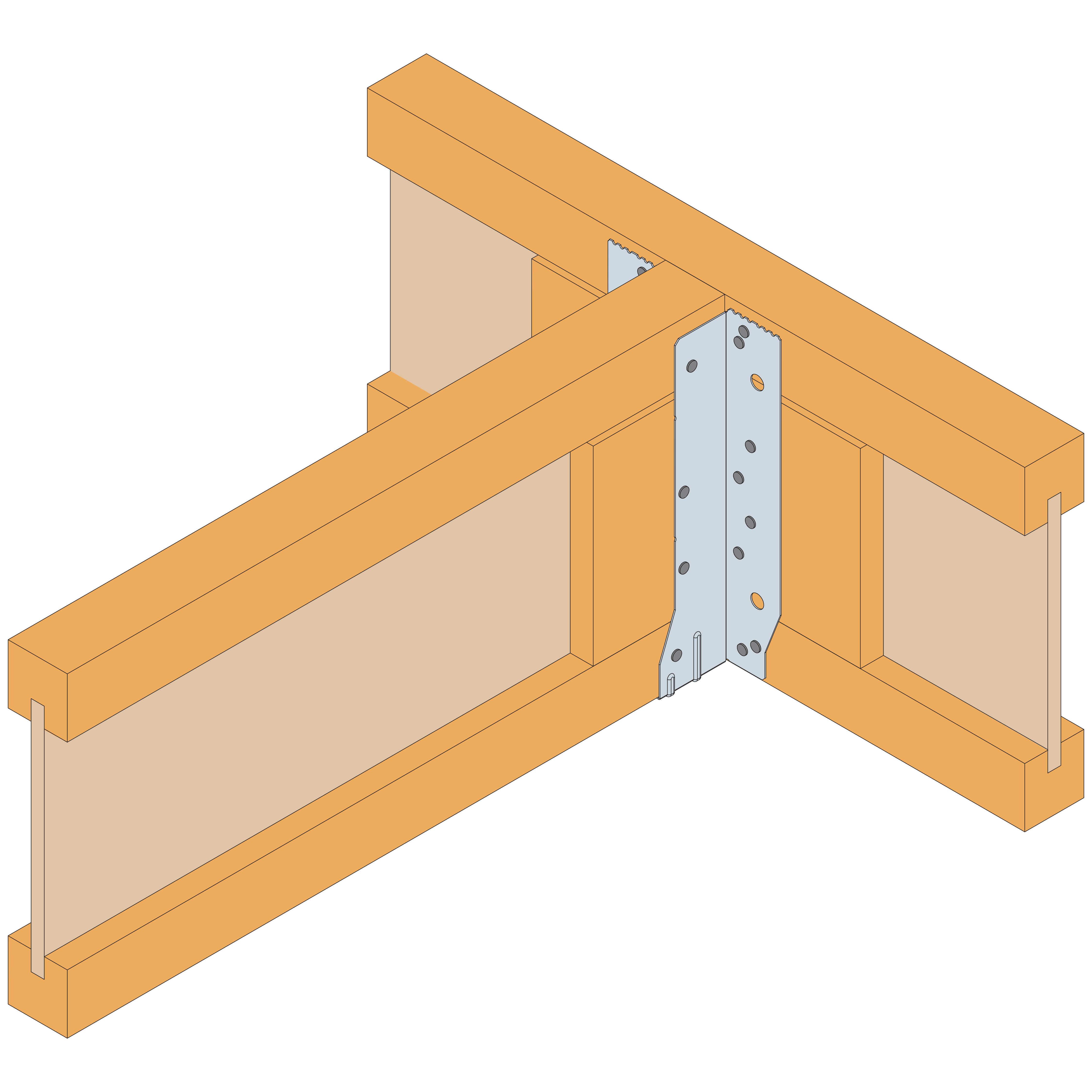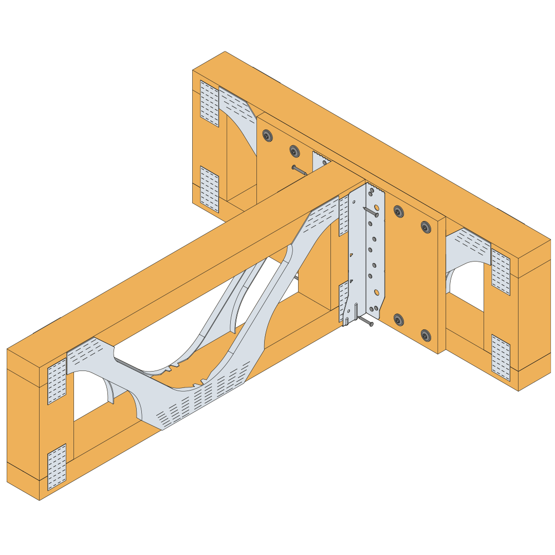 - Aseta tuleva palkki paikoilleen niin, että se on tiiviisti EWH-kannattimen takaosaa vasten (suurin sallittu rako on 3 mm tulevan palkin pään ja kannattimen etupinnan välillä) ja täytä kaikki pyöreät reiät sivulaipoissa.