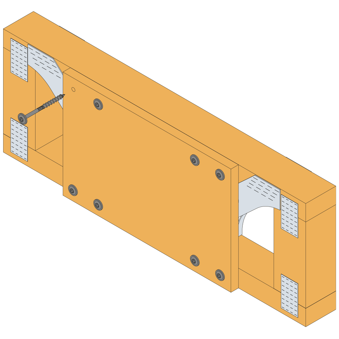→ Enhanced installation requires a 18mm plywood gusset to be fixed to the face of the metal web joist. The plywood gusset is to be at least 400mm long and full depth of the metal web joist. The plywood gusset is installed with 8 No ESCR8.0x80mm screws. The screws are to be positioned in accordance to illustration within the Installation Notes section.
