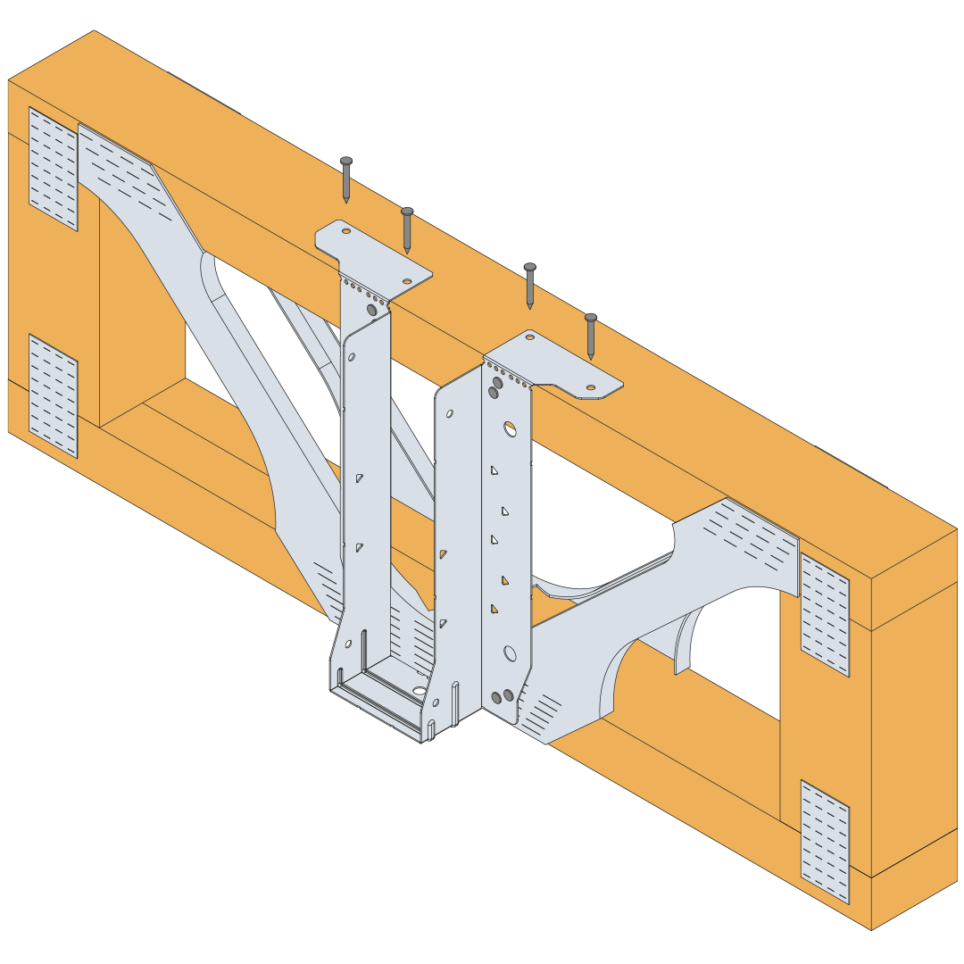 - Aseta kannatettava rakenne ripustimeen ja asenna 4 kpl 3.75x30mm neliökiertonaulaa pyöreiden reikien kautta tuettuun rakenteeseen.