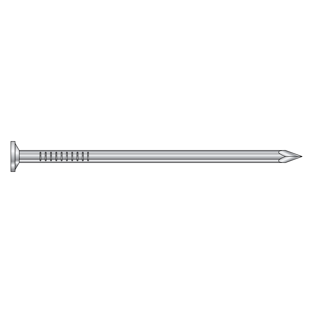 Nail with low oval head and grooved shank for use indoors to fix pre-painted fine joinery to timber, such as when fixing mouldings.