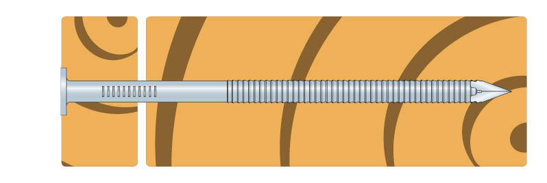 Cladding nail is mainly used for painted facades. The length of the cladding nail is developed to not penetrate the wind shield/protection behind the facade and the flat head covers the opened wood fibre after insertion. The ring shank increase the withdrawal performance and the 60 degree diamond point prevents splitting.