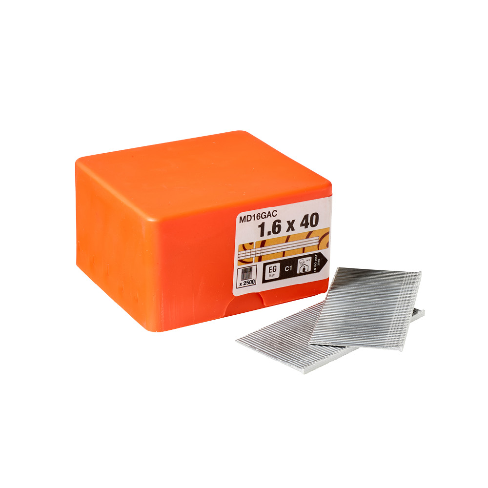 This brad with its rectangular head and shank is used indoors and in dry environments for fixing mouldings, panels and hardwood or semi-hardwood boards to a timber base. Dimension 1.4x1.6 mm.